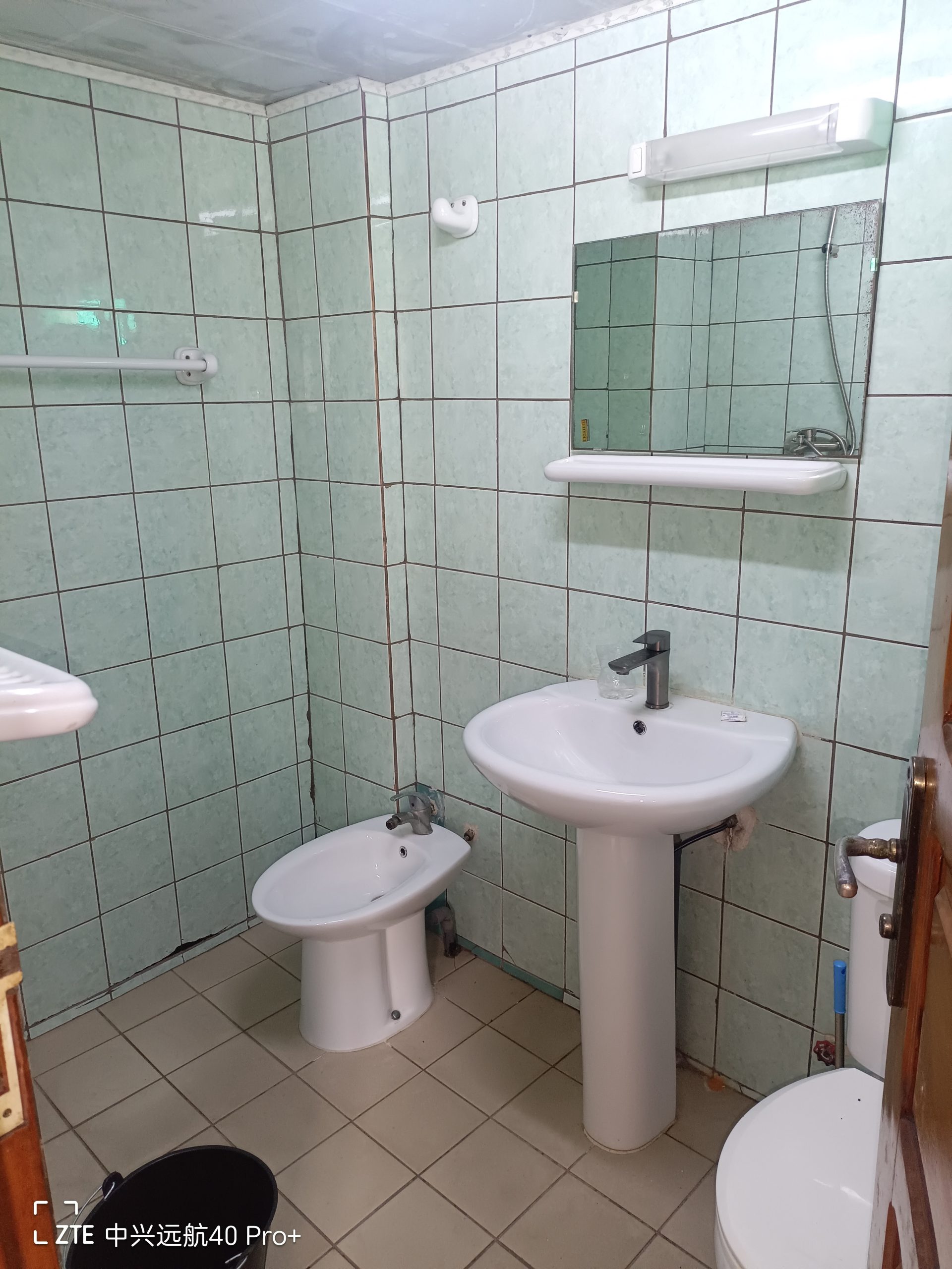 salle de bain aménagée d’un lavabo, d’un bidet, des wc, d’un miroir, d’un porte-savon mural, d’un porte-serviette mural et d’un seau