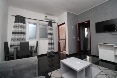 salon meublé d’une salle à manger, d’une télévision, d’un canapé, d’une basse vitrée-studio meublé à douala à bonapriso 25 Jan