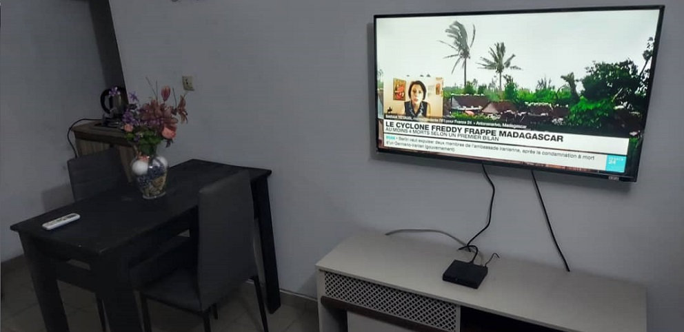 Studio meublé de douala bali aménagé d’une télévision à écran plat avec abonnement canal+, d’un meuble tv, d’un espace de travail de deux places